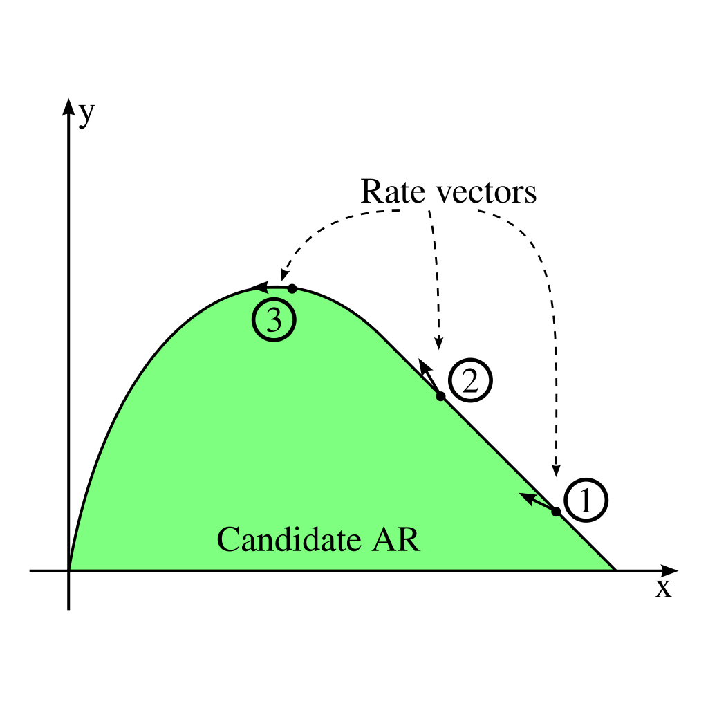 Hence, if it is possible to find a point $\mathbf{C}$ in the complement region that, when extended backwards with a straight line, intersects the region, then $\mathbf{C}$ is a CSTR solution and the region can be extended further.