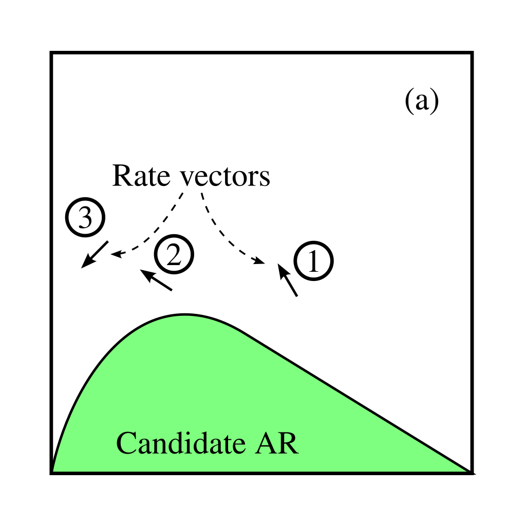 In this diagram the rate vector points outwards, thus this condition is not satisfied. We know from the section, Determining The Geometry Of The Process Units, that a PFR trajectory is tangent to the reaction vector. So, if a reaction vector points outwards at point c, we could use point c as a feed point to a PFR, and this would achieve output concentrations that lie outside of the candidate region. This allows the region to be extended and hence we have not found the region of all possible products, that is to say we have not found the complete Attainable Region.