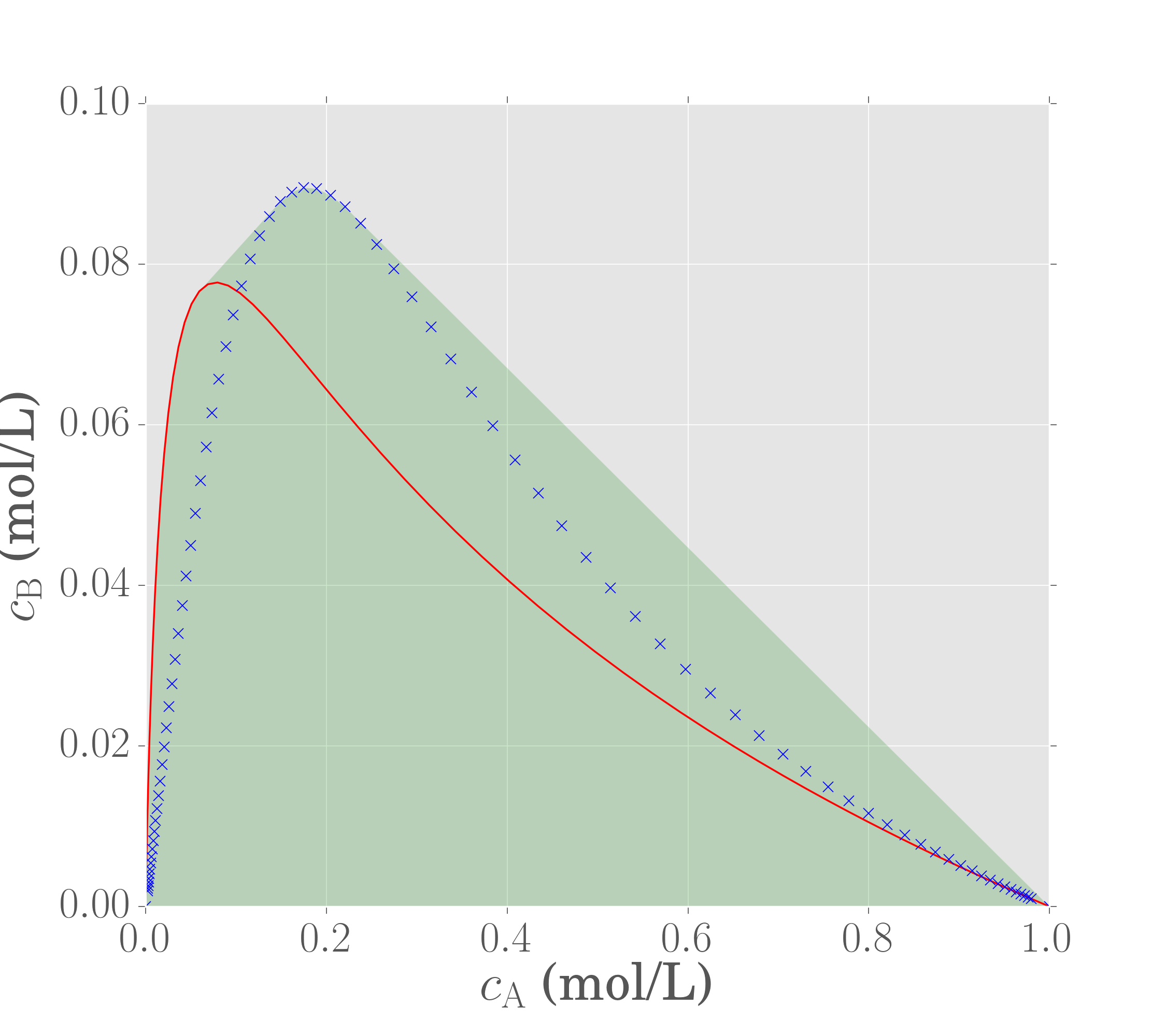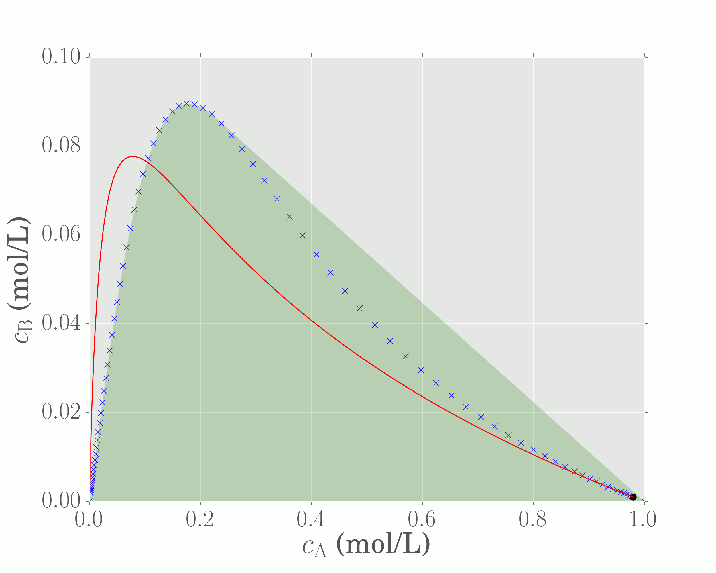 Recall again that the convex hull in AR theory represents the set of achievable concentrations obtained through mixing. Thus, when the convex hull of a set of points is calculated, we are including the process of mixing into the reactor structure. All points in the shaded region are thus achievable. We've generated the region by first finding the PFR trajectory from the feed and then finding the convex hull of these points.