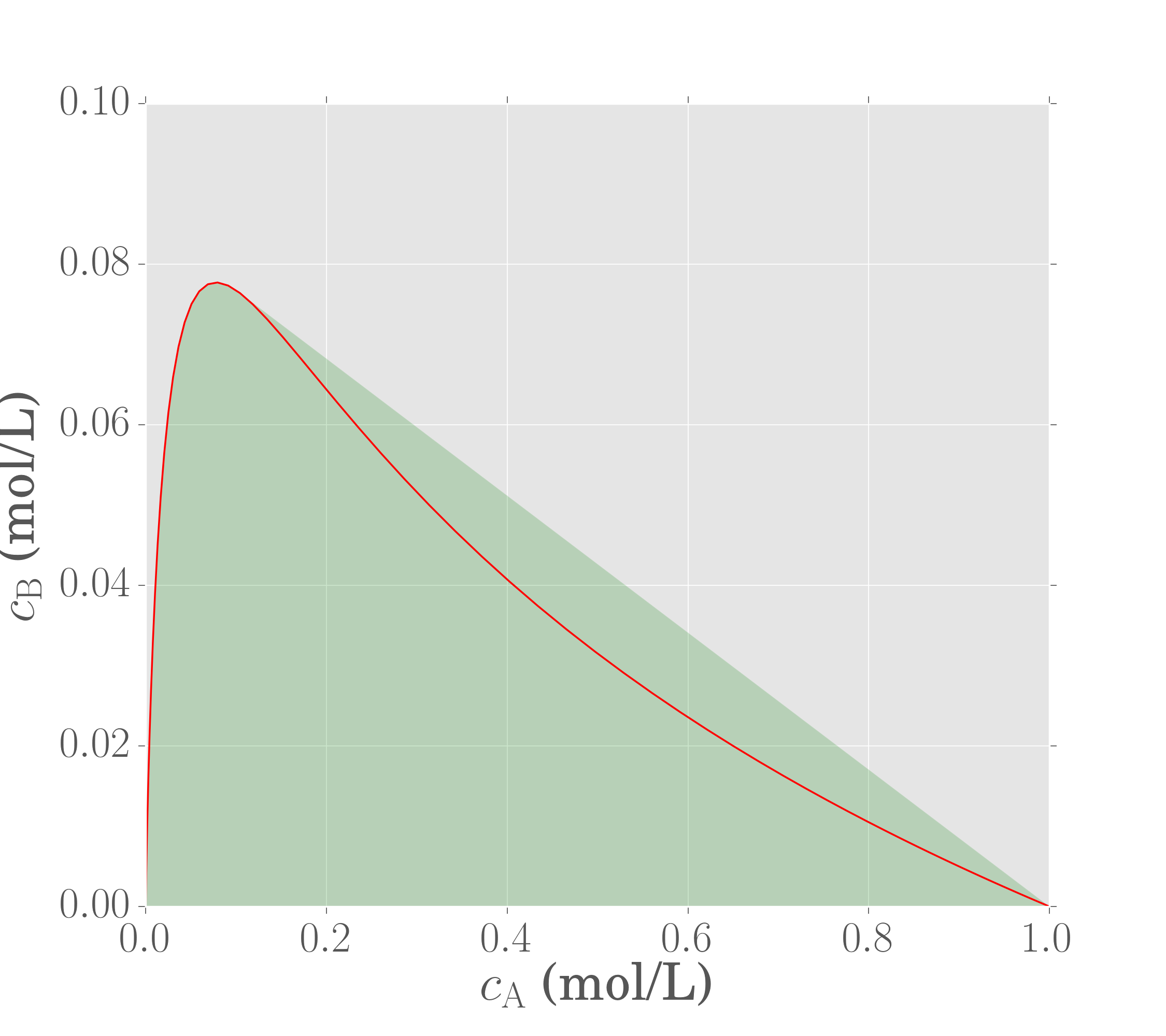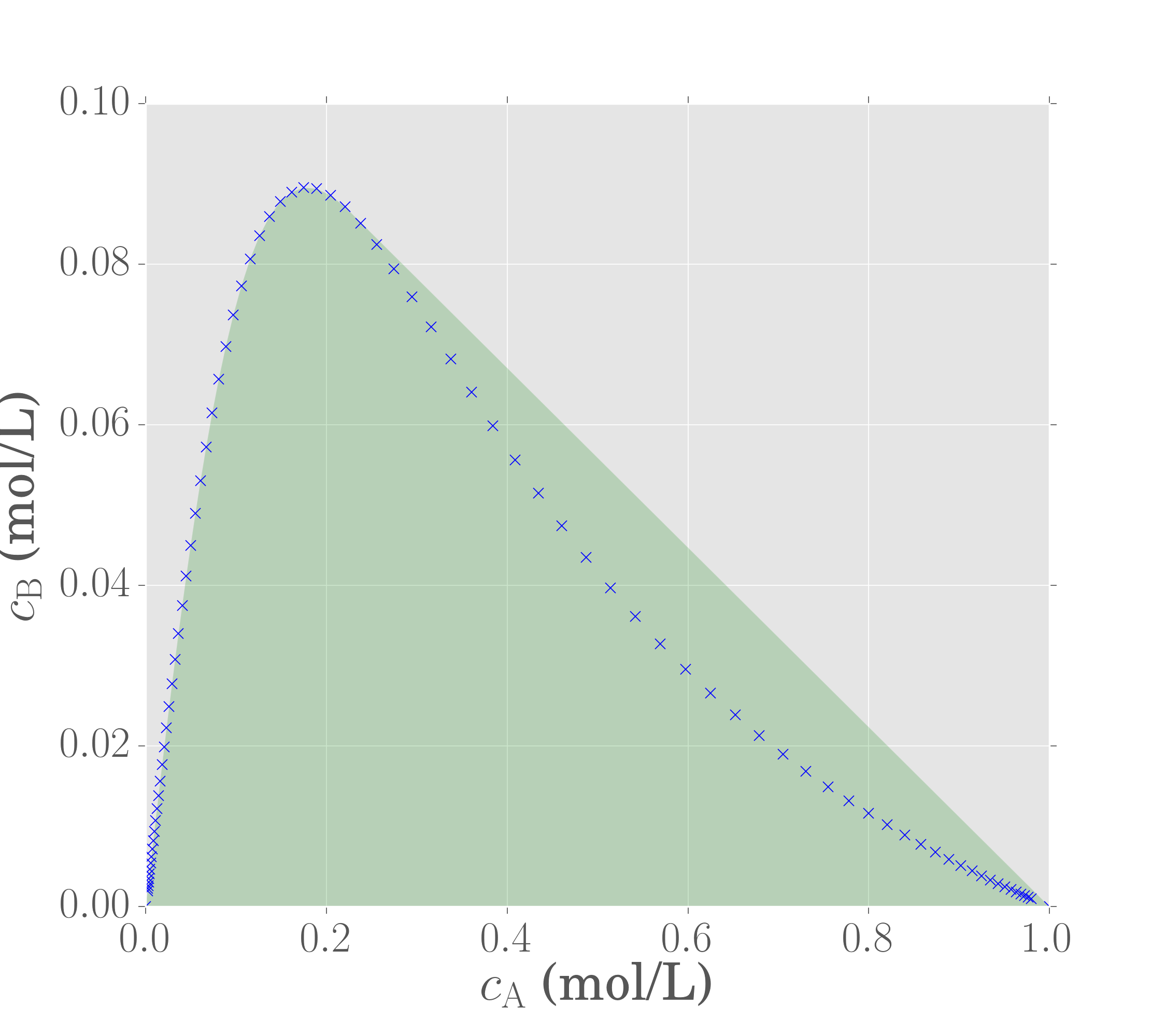 In order to generate a region of attainable points, we must begin with a knwon achievable point. By specifying a feed point, we are defining a known achievable state that will be used in our reactor network to generate many other achievable states. We have already, in the introduction, specified that the feed to the process is a stream of pure A, and so we have already specified a feed in this example. Since we are working in $c_{\mathrm{A}}-c_{\mathrm{B}}$ space, a feed of pure A written in terms of a concentration vector would then be