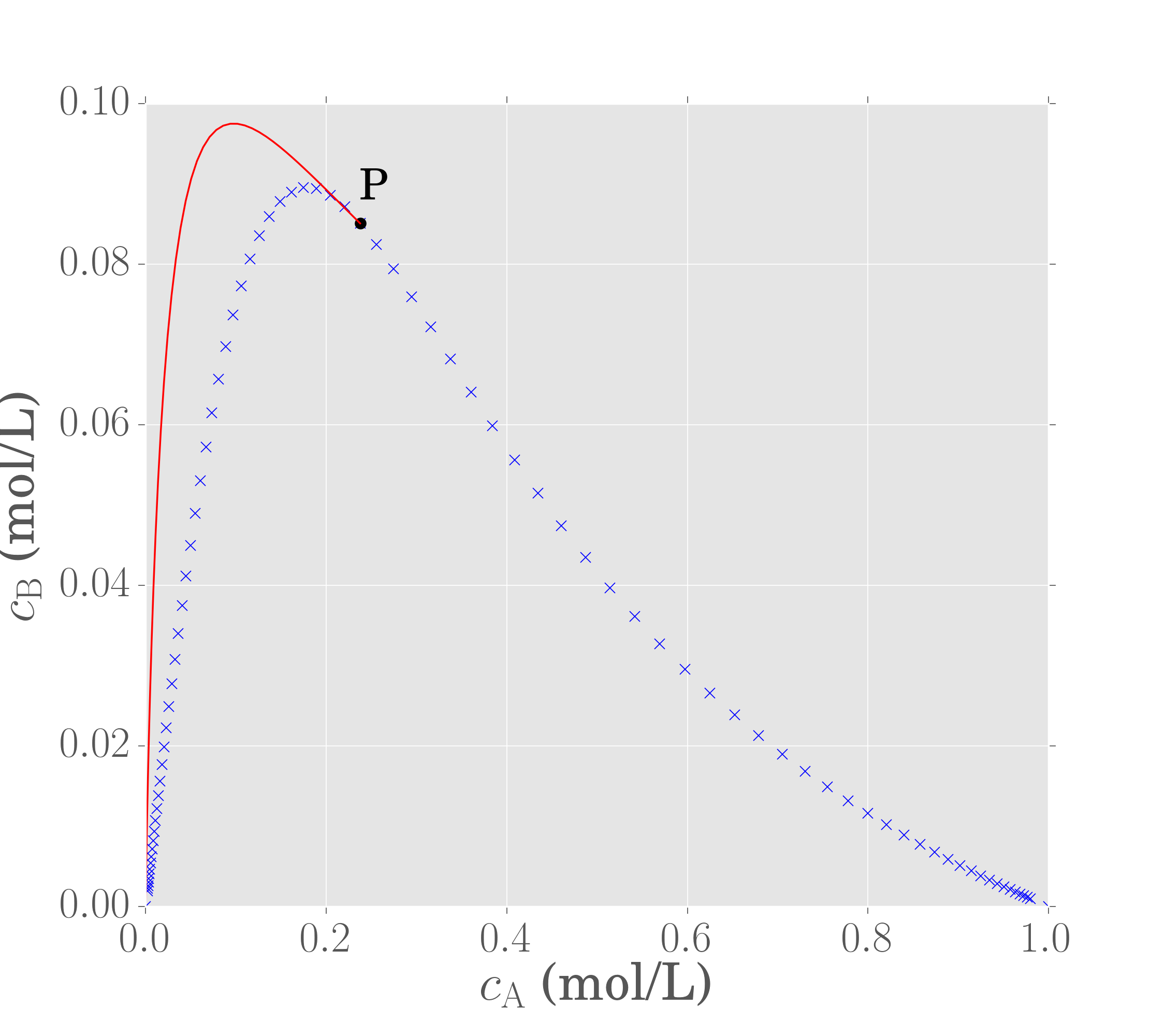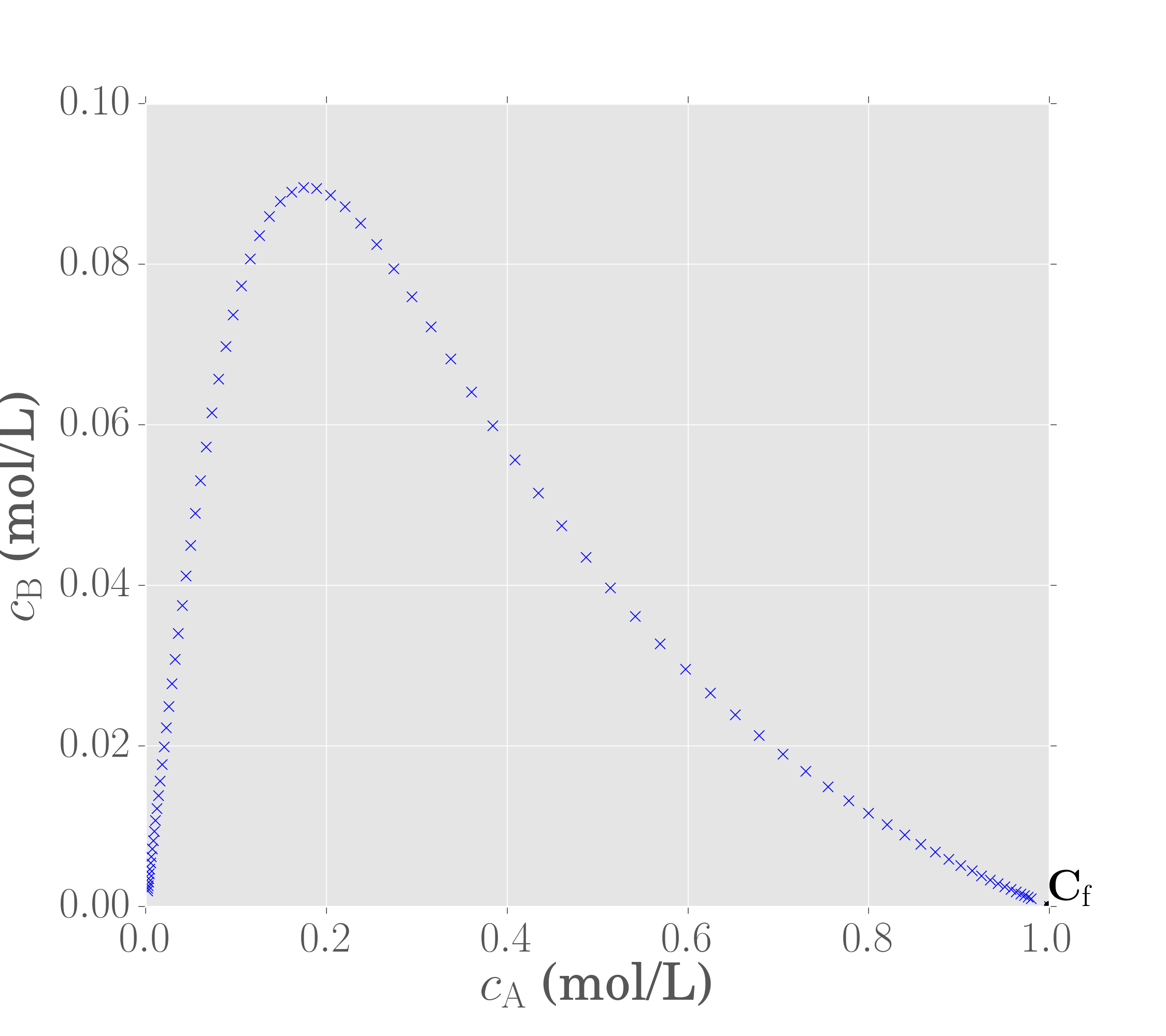 If we are interested in the production of component C or minimising the volume of the reactor network, then it would be reasonable to include $c_{\mathrm{C}}$ or $\tau$ in the state vector. The system would then need to be solved in a three-dimensional space.