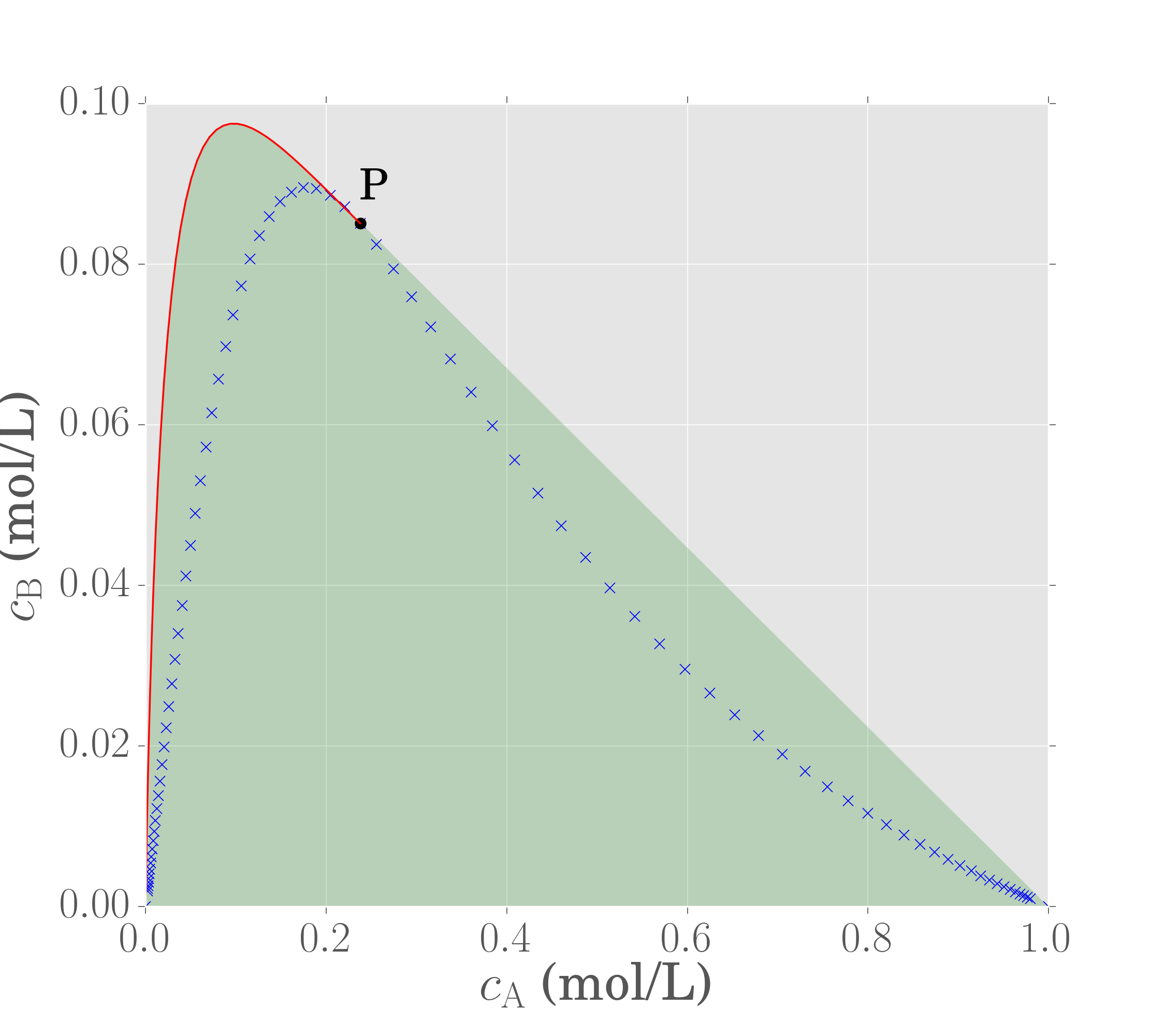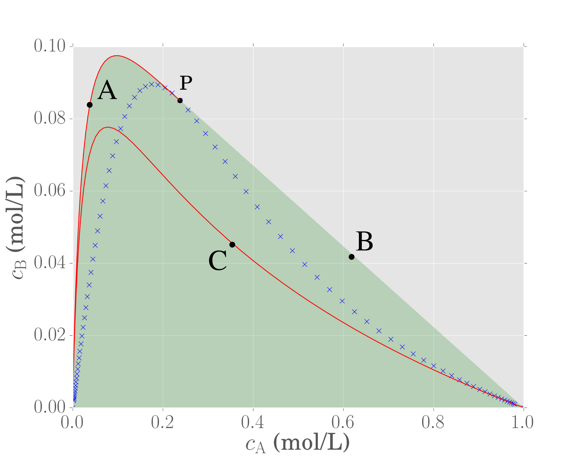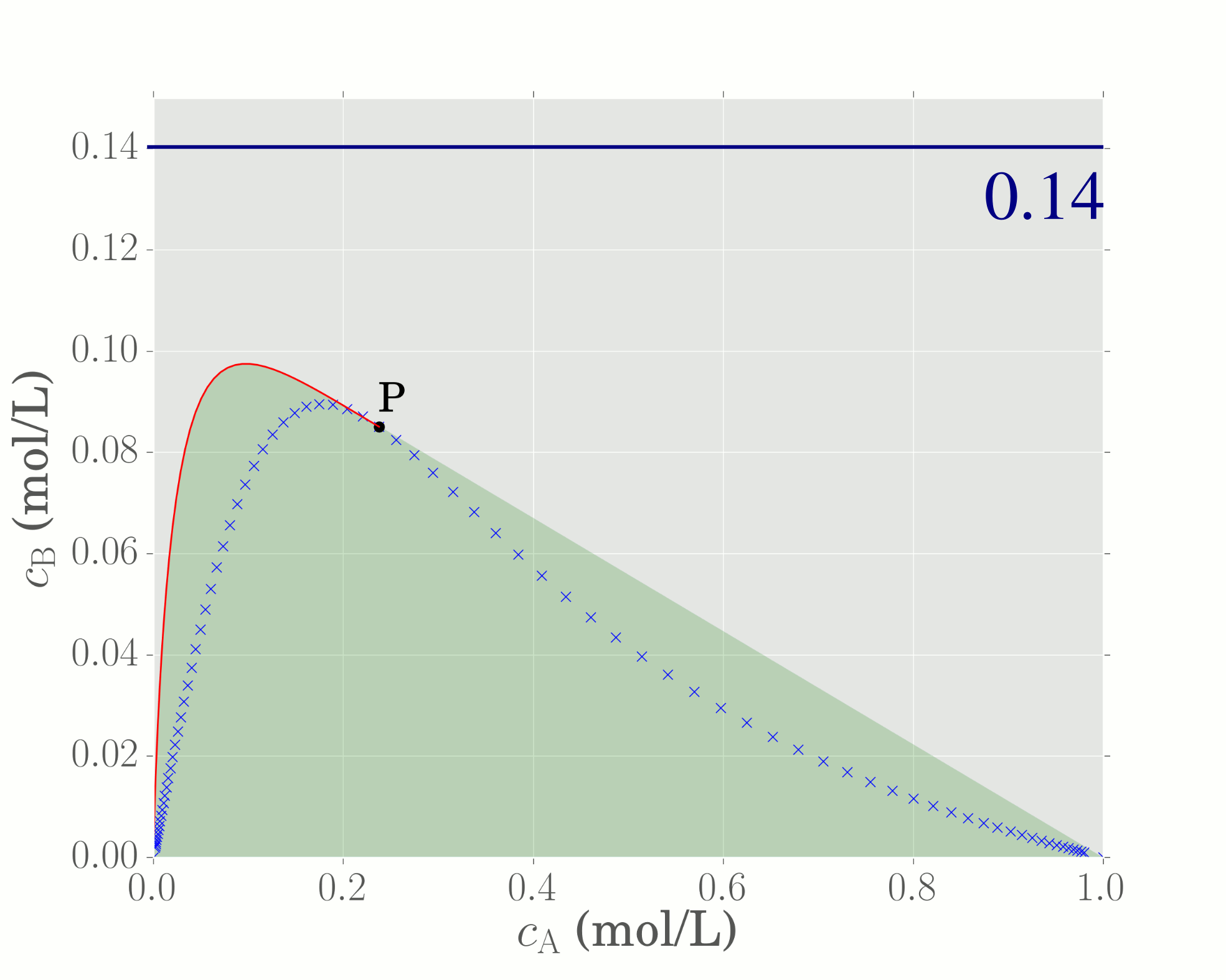 In the above illustration, a number of individual PFR trajectories are plotted from concentrations lying on the CSTR locus. Although these new trajectories (red lines) all appear to generate concentrations that extend beyond the current region, there is a specific point on the CSTR locus that generates a PFR trajectory that extends the region the greatest (it encompases all other red lines). This is marked in the figure as point P.