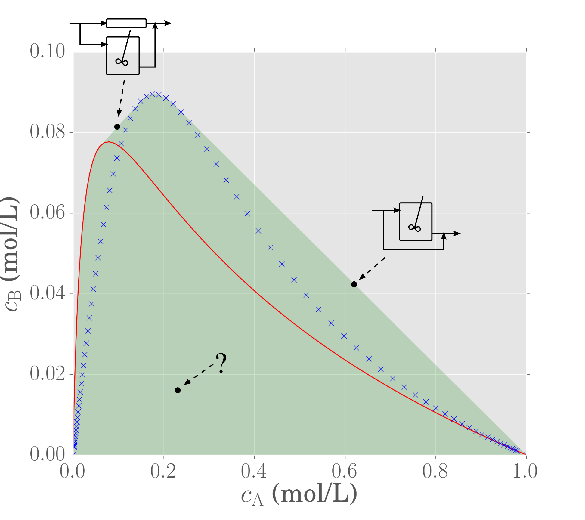 So far, we have managed to generate a region in concentration space representing the set of all achievable states in a steady-state reactor network using reaction and mixing. We then proceeded to apply objective functions to the region and check for points of intersection with the boundary, as a way to optimise the system for the objective under consideration.