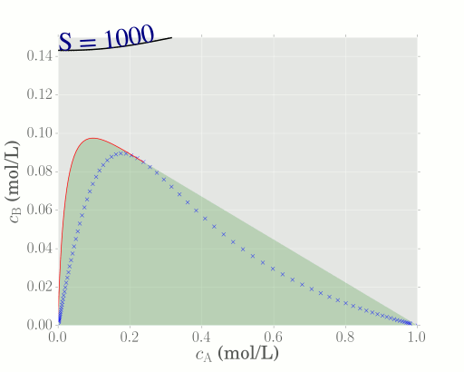 In this instance, the obective function is a quadratic expression in $c_\mathrm{A}$, and thus overlaying this objective function will intersect the AR at a different point on the boundary. We find that the optimal value of $S$ in this case is when $S = 680$.