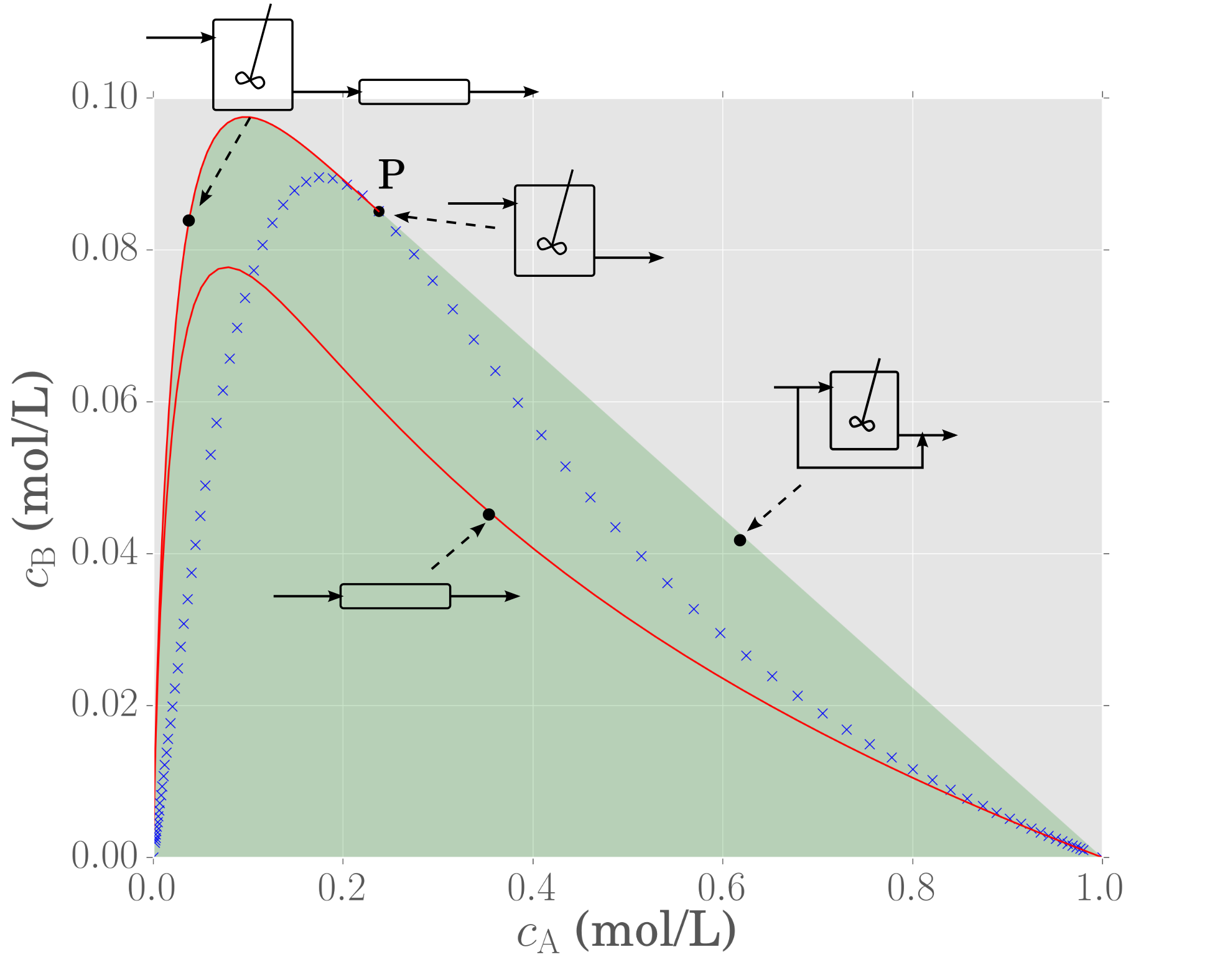 Seeing as the two objective functions considered here both occur at a point beyond the critical point P, the optimal reactor structure required by both objective functions is a CSTR follwed by a PFR in series. Mixing between these reactors then generates all concentrations in the shaded region.